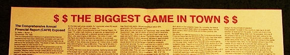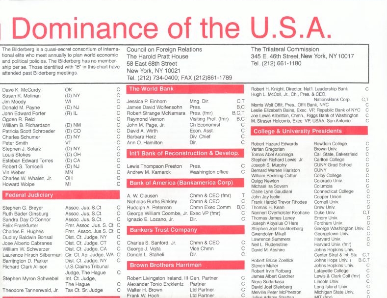 Under Red headings of 'College & University Presidents', 'The World Bank', etc, are listed names with up to three abbreviations showing who belonged to the Trilateral Commission, the Bilderberg, or the Council on Foreign Relations. Unfolded, it measured 17" by 22"; the front 'documented' CFR, Trilateral, Bilderberg Dominance of the U.S.A'; the back "$$THE BIGGEST GAME IN TOWN$$", 'The Comprehensive Annual Financial Report Exposed' by Walter J. Burien, Jr. A quick search for the author on Google is as far as I can make myself, and virtually every link is to his article about the CAFR. The Web was made for conspiracies.