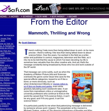 It doesn't take much to bring out the villagers and torches. Witness the decidedly cool reaction of professional science fiction to Michael Chabon's 'Thrilling Tales'. Over at SciFi.com, they're massing at the gates, with Scott Edelman and Kristine Kathryn Rusch grabbing the megaphones. They ponder the intended audience, the unintended insults, even the imagined audience: "I don't recognize those writers or readers," huffs Edelman. "They are straw men." (For the purposes of this essay, Edelman and Rusch will be be the straw men, er women, er --) "Chabon's essay is for the literary mainstream only" adds Rusch. "-those folks who read the prescribed Literary Novels (The National Book Award Winners; the New York Times Recommended Reading List) and the short stories that appear in the Atlantic and the New Yorker and nothing else." Gee, you say that like it's a bad thing.