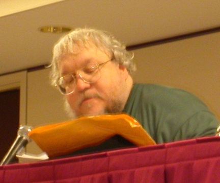 While I've read quite a bit of George's earlier work -- I bought a very seedy paperback collection ages ago in the Monterey Park bookstore -- I haven't read any of the more recent fantasy work that he's been doing. It all comes very highly recommended by people I trust, but the fact of the matter is that the radio station introduces a rather welcome uncontrolled element to my reading list, so I don't always get to read what I think I'd want to read, and neither has my wife. But the reading convinced me that there's a reason why everybody loves this new work so much. Martin has some great prose, and in the reading the pictures he painted were crystal clear, in spite of my utter unfamiliarity with his entire setup. Alas, at times the partitions that were pulled between the rooms allowed the sounds of those next door to impinge upon my consciousness. Still, the performance was powerful. I'm ready to sign up for his saga, and mayhaps will start reading them with the aim of catching up to his part of the saga slightly before the fourth book comes out. But it's clearly not yet done, and the six-book limit that Martin set for himself seems pretty porous at this point. I guess that originally there was to be a five-year gap between the end of book 3 and the beginning of book 4. That's now shrunk to a five-minute gap. One of the most interesting things about attending a convention is to see writers struggling with their own creations, to see them fighting battles with their own fiction. Martin wrapped up about five minutes before the end of the session and had just enough time to explain where things were. Then Claire and I were off to the races.