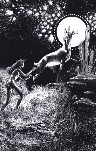 Now to the matter at hand, 'Medicine Road'. This is the first in a series of linked short novels about the Dillard Sisters. According to Bess, one of the sisters, "Back home there's more of us than you can shake a stick at -- seven of us sisters; nine girls altogether if you include our mother and Adie's little baby Lilly." Matriarchy is quite the thing these days in speculative fiction; from Graham Joyce's 'The Facts of Life', which features almost the same exact family living in Coventry in WWII, during the Blitz, to Stephen Baxter's eerie underground Marian cult in 'Coalescent', and even Terry Pratchett's 'Monstrous Regiment', we've seen our share of women in power. 'Medicine Road' is about Laurel and Bess, two "old timey" musicians who play music at bars and road houses. In a tour through the Sonoran Desert, they are drawn into an ages-old wager between Native American Spirits, prime DeLint material. I've offered up the cover and one of the illustrations, but this generously-filled short novel looks to be the start of a very classy and potentially classic series, a small-press collaboration between writer, artist and publisher with each contributing what it takes to make a whole much greater than the sum of the parts. In other words, a typical matriarchy, in this case, made up of men. |