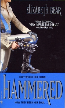 A very astute editor over at Bantam Dell told me that 'Hammered' was a book I'd definitely like -- the same editor who is bringing Jon Courtenay Grimwood to the US. Her taste is impeccable, and her recommendations shoot to the top of my list. Then, after my article on Ms. Moriarty, wherein I expressed my wonder at the recent spate of UN-oriented novels -- her 'Spin State' and 'Singularity Sky' and 'Iron Sunrise' by Charles Stross -- she wrote to tell me that, " If you want a really fun UN-rules-the-world future vision (also written pre-Iraq, though published later due to the vagaries of publishing), I strongly suggest you check out the book HAMMERED by Elizabeth Bear." Consider me Hammered. And pretty damn astounded by the fact that this book is debuting as a mass-market paperback. Presumably, that makes it a lot easier for people to put it at the top of their "must-buy" list. Because this novel should certainly be there. And I can guaran-- oh wait, this isnt that article is, it? I can guarantee that this book will get a Philip K. Dick Award nomination, and a best first novel nomination, and she'll be up for a John W. Campbell award. Bank on it. But who gives a damn about the awards? The book's the thing.