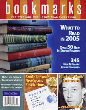 In their "Have your read?" column, Bookmarks mentions the enjoyable 'Getting Mother's Body' by Suzan Lori-Parks. So here's my opportunity to mention that I now have an interview with this author by KUSP interviewer Jenn Ramage available for my readers as MP3 and RealAudio. You'd do well to send some donations to KUSP via their web page, as my involvement with this NPR affiliate helps keep this column cooking. Jenn is an outstanding interviewer and this KUSP is well worth support. Enjoy, contribute, and recognize that since I don't have ads and don't solicit contributions, you can probably spare a few pennies for KUSP -- but do mention this column if you donate! "Have You read?" also includes 'The Red Tent' by Anita Diamant, which was the demo-review that Katie Dean gave me a couple of years ago, is it now? Damn, time flies. And 'The Body: A Novel of Reincarnation' by Laurel Doud. A middle-aged mother of two wakes up in the body of a rich young man bent on self-destruction. Long articles cover E. M. Forester ('Howard's End' and the proto SF story 'The Machine Stops') and Albert Camus, author of 'The Stranger'. They also review a potentially intriguing book titled 'Tokyo Doesn't Live Here Anymore' by Ray Loriga. I'm going to see if I can lay my hands on it, for with its Phil Dickian memory-altering plot, it sounds potentially interesting. Moreover, reading it might give me a better bead on what 'Bookmarks' does with science fiction. In the SF category, they review Stephen King's latest Dark Tower novel and finally, finally, what made me open the magazine, a review of China Miéville's 'Iron Council'. Now 'Bookmarks' idea of in-depth reviews is certainly not mine. You dont get an essay about the pros and cons of the book -- you get a paragraph of plot summary, a paragraph of critical summary and blurbs from other publications in-between. Well, they're quickly read. Maybe they could call it '50 reviews to faster reading'.