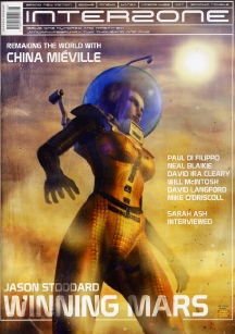 While Finney takes the lion's share of the new fiction in this month's Interzone, there's a lot more to make the little man jump out of his chair. (Our local newspaper uses one of those graphic-based rating systems for movie reviews, and were I to use it for Interzone, this one would have serious chair-jumping action.) You get the amazing Paul Di Filippo's 'The Emperor of Gondwanaland'. Di Filippo is the kind of veteran author that Interzone's old-guard readers have been hoping to see and he never disappoints. Neal Blaikie lives within driving distance of this writer, and debuts with 'Ducks in Winter', a beautifully surreal stellar-scale story. China Miéville gets the Interzone interview treatment, more of an essay than a conversation. Interzone also publishes and supports the James White short story award winner, 'Lost Things in Saved Boxes' by Deirdre Ruane. In a bit of synchronicity with Richard Clark, Ira Cleary reveals 'The Face of America'. Clarion graduate Will McIntosh gets this issue's Edward Noon illustration for his story 'Totems'. Mike O'Driscoll takes on the genre issue -- damn, I love that straw man, looks what he's doing for this article! The book reviews include Sandy Auden's Q&A with Sarah Ash, as well as a couple of mine. What more can you ask for?